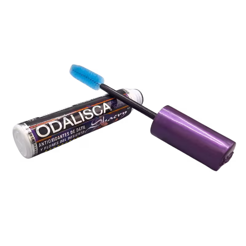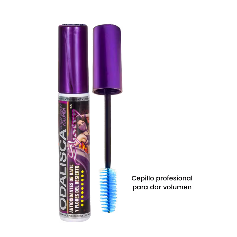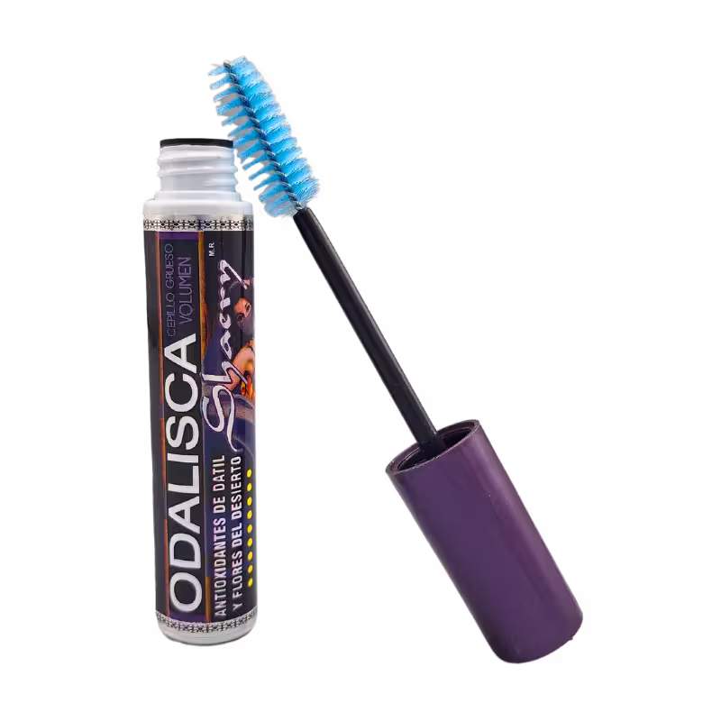 Rímel Odalisca con innovador cepillo profesional para dar volumen, y su fórmula enriquecida con extractos de dátiles y flores del desierto.